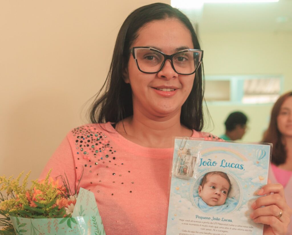 João Lucas nasceu com 1,193 quilos e 37 centímetros, enfrentando desde os primeiros minutos de vida uma jornada marcada por desafios clínicos. A coordenadora de Enfermagem da UTI Neonatal, Nathalia Duarte, acompanhou de perto cada etapa desse processo. “Ele chegou prematuro, foi um recém-nascido de grandes desafios, que sempre nos dava alguns sustinhos, mas foi evoluindo super bem com todo o aporte médico, da fisioterapia, da fonoaudiologia. Depois que foi para o Método Canguru, intensificamos o estímulo via oral, para ele voltar a sugar. Hoje, ele sai tomando leite pela chuquinha e também ao seio. São grandes vitórias. Desde o nascimento, ele sempre mostrou que buscava a sua vitória. E hoje chegou o dia”, comemorou.